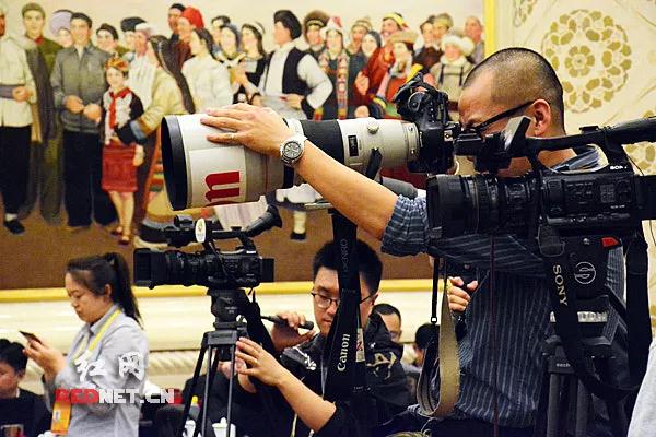 10月19日下午举行的党代会湖南代表团媒体开放日,65家中外媒体的近百名记者参加。
