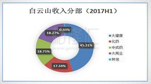 白云山主要做三个板块,大健康、大南药(化药、中药)和大商业。大健康一直以来都是白云山的主要受益点,而整个板块的主要收入就是整个板块的收入主要来自于王老吉凉茶,现在王老吉业务主要由2012年成立的控股子公司王老吉大健康,以及合营公司王老吉药业。2017年上半年大健康板块贡献了49.99亿元人民币,同比增长6.33%,毛利率41.17%,同比下降了7.69个百分点。