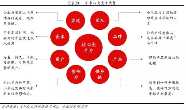 “八大优势”助力小米生态企业脱颖而出。小米的优势包括团队、产品、品牌、用户、供应链、渠道、资本和影响力。小米一直以来招纳各领域全球顶级的人才,组建成了一支最优秀的团队。通过优秀的人才做出最好的产品,打造出有“温度”、有个性的品牌。