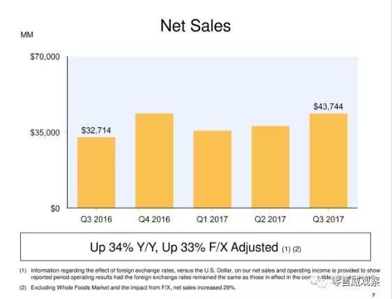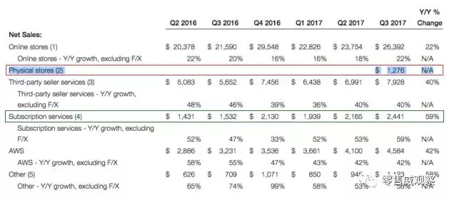 这里,还有一个数字值得关注,在亚马逊Q3报表中的净销售收入细分中,亚马逊公布了其实体店的销售额(表内红色部分),达到12.76亿美元,这也是亚马逊收购全食超市后,首次公开其销售业绩(当然这里也有亚马逊书店等实体店的销售额)。