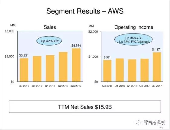 在截至9月30日的2017Q3财报中,亚马逊北美销售收入254.5亿美元,同比增长34.9%,全球业务收入增长29.2%,云服务(AWS)增长41.8%。本季度净收入达到2.56亿美元,去年同期为2.52亿美元。