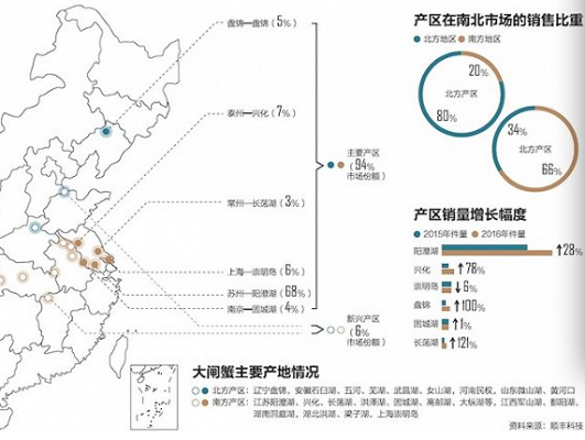 “过去大家对大闸蟹的认识更多停留在阳澄湖这一产区,一方面是渠道局限,阳澄湖大闸蟹除了有很多专营店,在超市卖场这些地方也是总被追捧。其他产区的大闸蟹在知名度上逊色得多了之后,身价自然不及阳澄湖大闸蟹。不过阳澄湖大闸蟹‘十买九假’是业内熟知的。电商竞赛蔓延到大闸蟹后,对我们这样非阳澄湖产区的蟹农来说肯定是利好的。培养了消费者的同时,对物流成本的控制也更有利。今年环保、印刷等成本都在上升的情况下,一票大闸蟹的价格还能维持在40~50元。”位于太湖产区的蟹企负责人崔伟向第一财经记者透露。