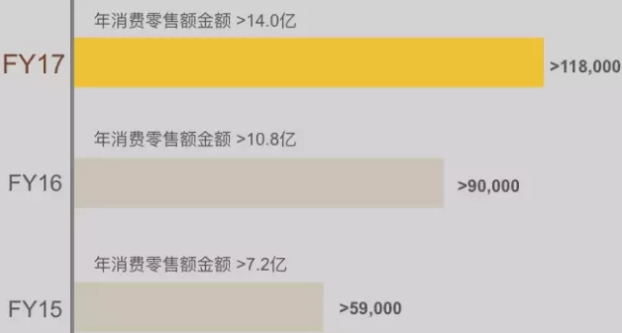 期内,集团已经拥有会员账户逾200万个,其中微信账户数逾150万个。在 2017财年,会员所贡献的零售额占零售总额的62.6%,集团的活跃会员账户数目已超过26万个,2017财年购买总额超过人民币5000元的会员账户数目逾11.8万个,其消费零售额亦达到人民币14亿元。
