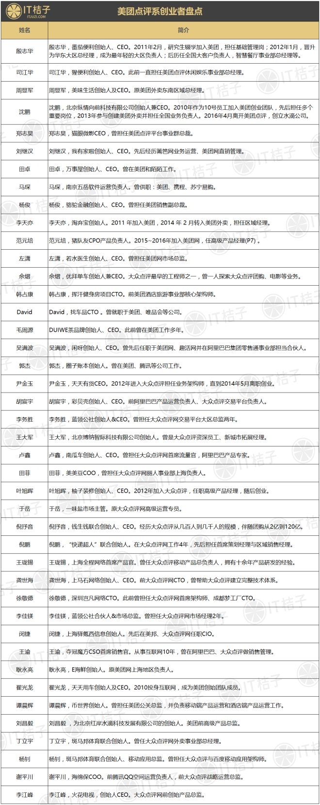 虽然目前美团点评系创业者和阿里、百度、腾讯、网易等类似的创业派系的规模相比还有些差距,但是在美团点评上市以后,相信还会有一大波员工出来创业,形成一个更大的创业派系。IT桔子作为创投领域最专业的数据库,也会持续跟踪各个大公司和新锐公司的离职员工创业情况。