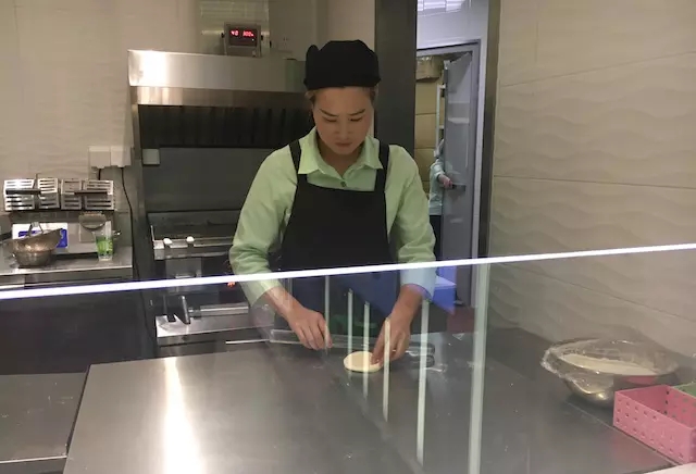 在这家开在集团园区里的“未来门店”,不仅装潢显得更加现代感,在菜品上也会测试性地优先上架新品。比如说,目前在这家门店里你可以点到面皮是新鲜擀出来的“非常堡”,我们计算了一下时间,大概五分钟可以吃上这样一个新鲜面皮的汉堡,比想象中要快。