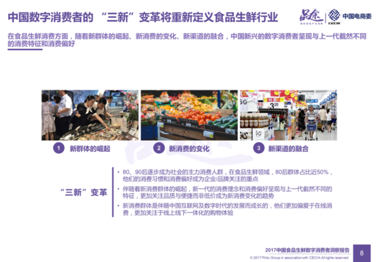 报告显示,随着80、90后成为中国新的消费主力军,中国生鲜消费将呈现渠道数字化、消费体验化和购物品质化三大趋势,也将进一步推动农产品销售、农产品流通、农产品加工和生产的互联网化,乃至驱动农业和互联网全面融合。