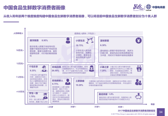 本报告从收入和年龄两个维度构建中国食品生鲜数字消费者画像,将目前中国食品生鲜数字消费者划分为数字新贵、小资生活、富裕家庭、个性乐享、职场白领、小康之家、学生一族、职场新鲜、工薪家庭、勤俭持家十类人群,从而进行人群消费偏好分析。