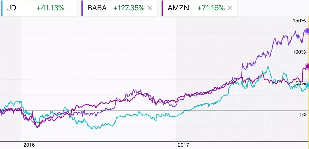 反映到股价上,京东还不错,投资者两年时间可以获得接近四成的回报,但阿里巴巴的投资者在同样的时间内却大赚了一倍还多。