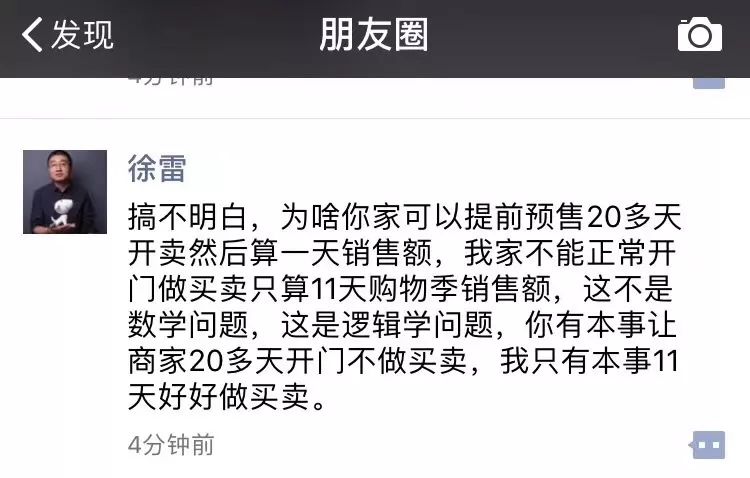 京东集团CMO徐雷在朋友圈回应称:“搞不明白,为啥你家可以提前预售20多天开卖然后算一天销售额,我家不能正常开门做买卖只算11天购物季销售额,这不是数学问题,这是逻辑学问题,你有本事让商家20多天开门不做买卖,我只有本事11天好好做买卖。”