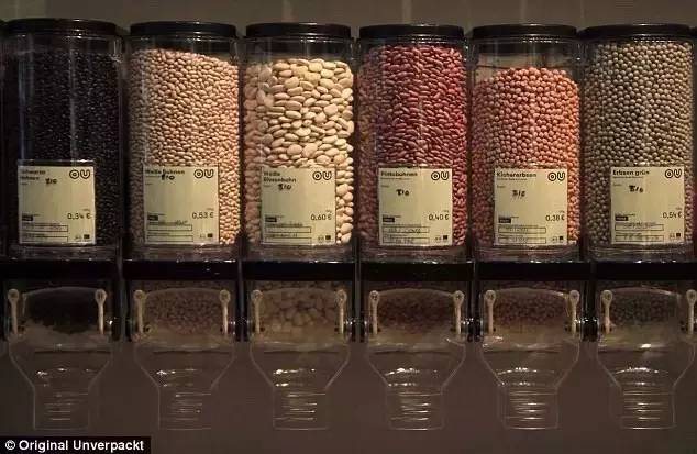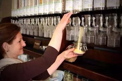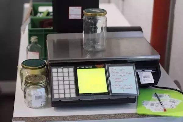 这家超市里不出售任何一次性的盒子、袋子、罐子或其它容器,只提供散装谷物、饮品等,顾客需要携带自备容器来购物,自备的包装盒先自行称重贴标签,最后结帐时,再将其重量扣除。