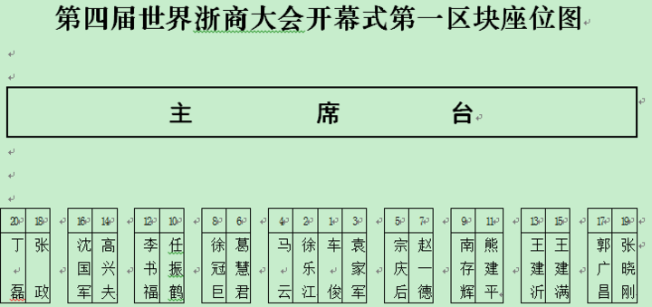 第四届世界浙商大会刚刚开始,浙江新闻客户端记者拿到了一份大会开幕式第一区块的座位表,领导干部与浙商依次就坐,一张座位里,亲清有道、相敬如宾的新型政商关系,溢于言表。 省委书记、省人大常委会主任车俊同志在前排中间就坐。左起分别是中央统战部副部...