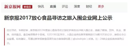 经过寻访、专家初审,新京报2017年度放心食品寻访之旅初步筛选出24 家入围企业,涵盖粮油、乳业、 饮料、酒类、休闲食品、食品电商等多个食品领域。12月19日-28日,入围企业将在新京报网进行为期10天的公示,接受社会公众监督。 新京报网公示页面截图 24家企...