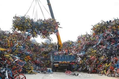 近期,在福建厦门一堆场,暂扣的共享单车堆成“小山”。拉车师傅说,每天要处理1000多辆,光这里就堆了近10万辆。