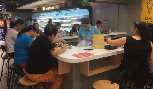 《中国消费者报》曾于周一工作日的中午前往盒马鲜生十里堡店,店内人头攒动,有在生鲜区挑选的,加工区排队的,也有在就餐区大快朵颐的,而不少消费者在休息区等位。