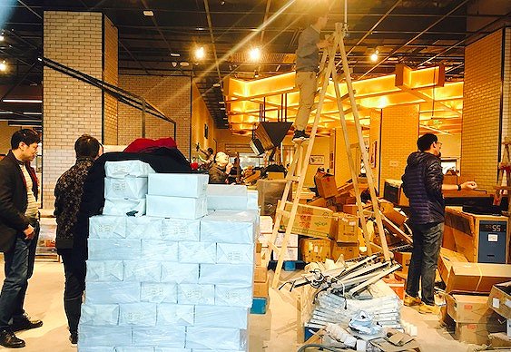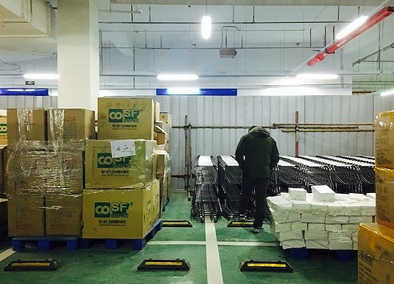界面新闻记者于12月26日下午在大族广场看到,零散的7FRESH配送员和员工已经在还未完成装修的门店外待命,所有的货物被堆在地下车库中的一个临时库房中。一名配送员告诉界面新闻,因处于筹备期,线上订单存在部分缺货情况。目前该店共有四五十名配送员,未来会增加至200名左右,“京东本身有配送员,会根据需求调配”。
