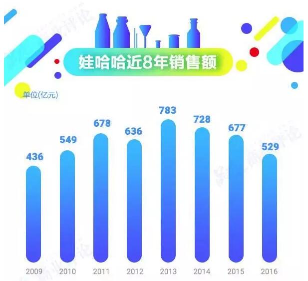 人生总会有起伏,企业也是如此。1987年创立的娃哈哈,用了4年时间就将产值做到了2.17亿元,在2003年实现了100亿的突破, 2013年走上巅峰,营收达到了782.8亿,乐观的宗庆后将2014年的目标订在了千亿。但是事与愿违,2013年成为了娃哈哈的转折点,2014-2016年娃哈哈营收分别为720.43亿元、494.74亿元、455.92亿元,名次从31位跌至104位。娃哈哈业绩下滑已然是不争的事实。