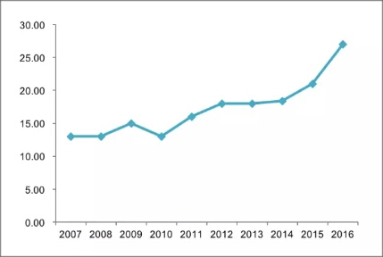 图4:2007-2016年金融机构杠杆率(%)