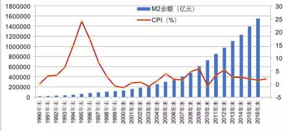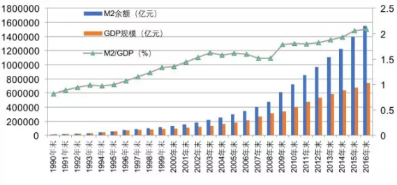 图14:历年M2余额、GDP规模及比值(1990-2016)