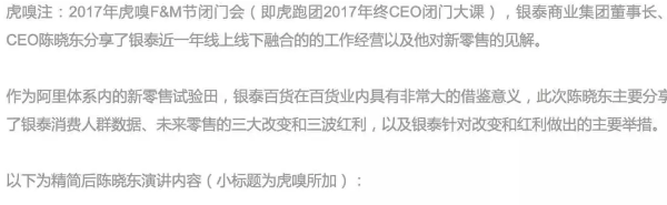 至于百货类(银泰),前段时间,刚刚读到了银泰董事长、CEO陈晓东的演讲,截张图: