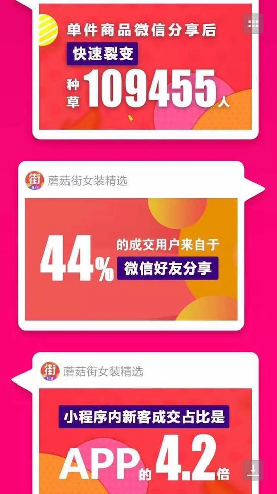 社交电商的优势尽显:在双十一的蘑菇街女装精选小程序成交用户中,超过4成来自于微信好友分享,小程序内新客成交占比达到蘑菇街APP的4.2倍;小程序用户购买手速达到APP的2.28倍。