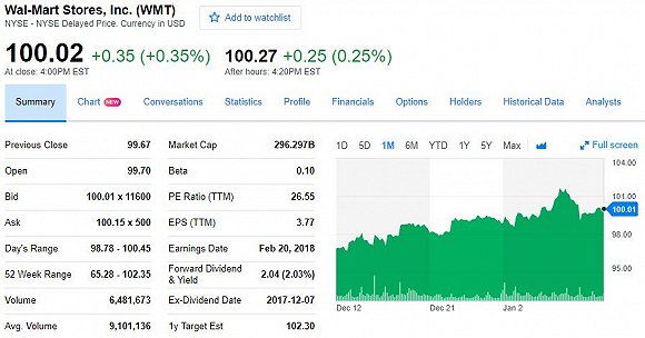 此消息传出,沃尔玛股票午盘时小幅上扬0.22美元,至99.89美元/股,最终收涨0.35%,突破100美元关口,创1月9日以来最高,也接近1月8日所创102.35的历史新高。
