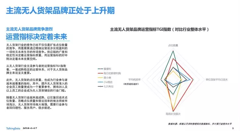 不过,激烈的竞争同样存在,白皮书显示,以市面上主流的无人货架品牌运营指标TGI指数来看,猩便利、每日优鲜便利购、果小美、小e微店、七只考拉的较量集中在点位数量,平均损耗率、每周补货频次、单位货架平均日流水等几方面。由此可见,无人货架的博弈已经不是单点博弈,而是全方位的综合实力比拼。