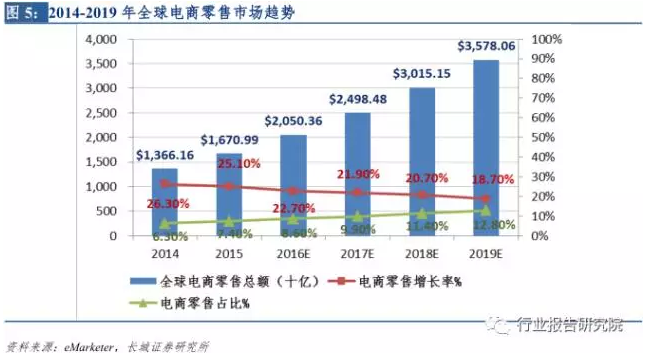 线上零售额占比仍有上升空间,对线下零售的冲击仍未消除,但全球电商零售总额的年增速正逐渐放缓。