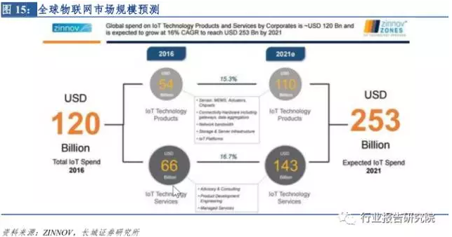 市场规模方面,据ZINNOV数据,2016年全球企业在物联网技术的产品和服务上的支出预计将达1200亿美元,2021年这个数字将增长到2530亿美元,达到16%的年复合增长率。