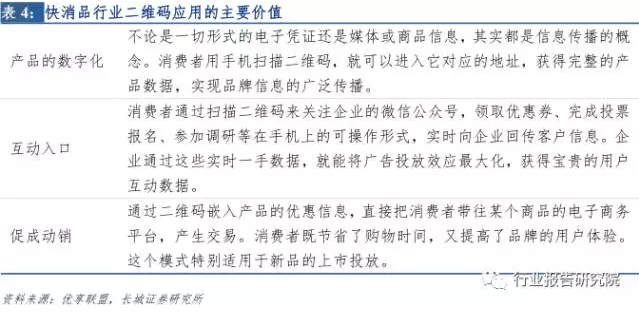 快消品行业是较早使用二维码强化O2O营销的行业,2014年恒大冰泉与A股上市公司天源迪科在二维码商业模式上的合作,掀起了快消品行业二维码应用浪潮,五粮液、茅台、古井贡、王老吉等厂商纷纷也采用二维码商业模式。