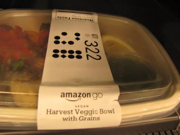 有意思的是,AmazonGo对商品的识别方法应该比外界想象得更丰富。比如,店内自制的沙拉和三明治等的塑料盒子外面有类似条形码(图中点状物),这也是多种摄像机捕捉的信息之一。