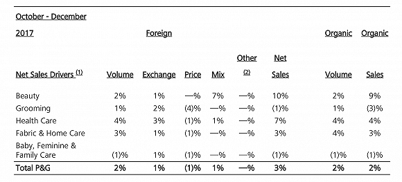 也有好消息,在2016年宝洁精简美妆业务,把逾40个冗余美容品牌出售给科蒂后,宝洁美容部门的增长明显。财报显示,美容部门在10-12月的二季度有机销售增长9%,与一季度5%的增速相比进一步提升,领涨其它部门。