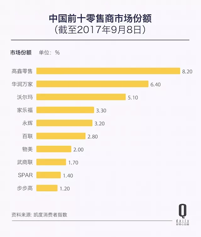 从排名第一的高鑫零售(大润发+欧尚)也只占 8.2% 的市场份额来看,这是一个市场比较分散的行业。