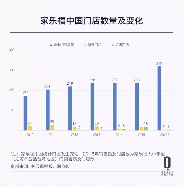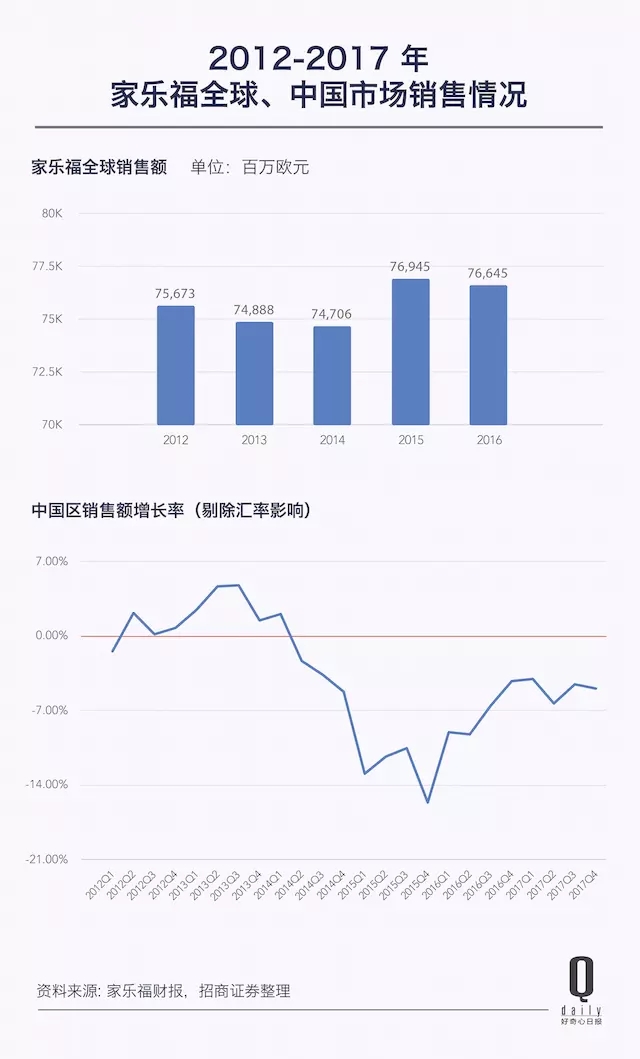 1 月 18 日,家乐福六个月内第二次下调了 2017 财年盈利预期:预计 2017 年收入增长 1.6% 至 882 亿欧元(此前的增速口径是 3%),经营利润下降 15% 至约 20 亿欧元。拖累家乐福的主要就是中国市场,其中法国同店销售增长 0.8%,亚洲下降 3.7%,中国下降 5.5%。财报中,家乐福直接把 2017 形容为“艰难的一年(A difficult year)”。