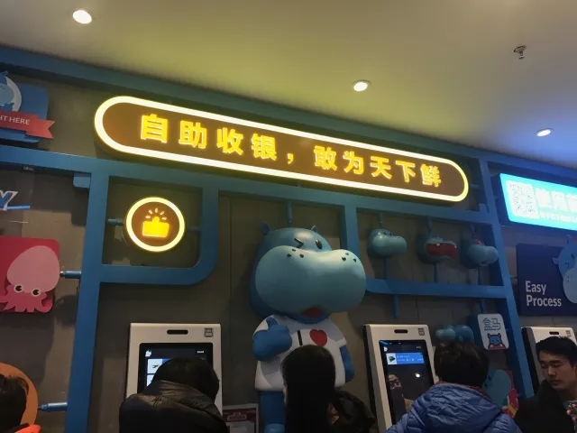 最后一个让我感到需要改进的地方是,虽然盒马鲜生用了很多的自助收银设备取代了传统的人工结账台,但是显然并不是可以省去人工——自助收银台并没有那么智能,依然需要服务员在帮助用户结账,这个看起来很大的结账设备实际上仅仅是充当了扫描枪的作用。