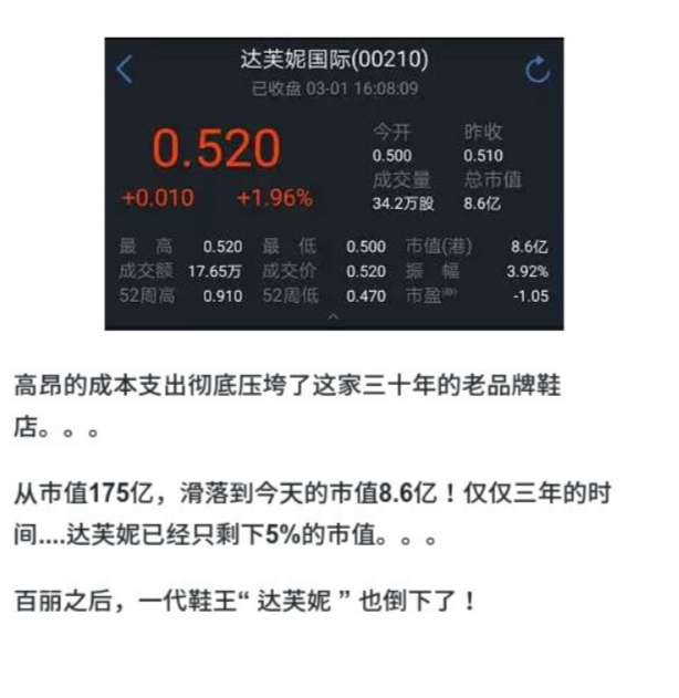 近日,鞋类品牌巨头达芙妮发布2017年第四季度财报:2017年,达芙妮净亏损高达近8亿港元;同时,2017年达芙妮集团在全国范围内共关闭1009个销售网点,其中包括317家达芙妮直营店。不慎唏嘘!谁都没有想到,一代鞋王“ 达芙妮 ”竟然没落到了这一步!一下关闭了近三分之一的门店网点!!!短短三年的时间,达芙妮的市值更是从巅峰时期的170亿跌至如今的8亿,仅为当时的5%......