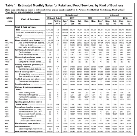 从上表中可以看出,美国类似中国2017年“社会消费品零售总额”的数据为57564亿美元。各分项的数据也有,美国是按交易发生的店铺类型进行分类统计。各大类分别是: