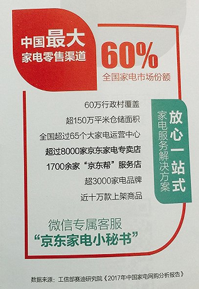 界面新闻记者注意到,在京东分发的宣传册中,一份工信部赛迪研究院《2017年中国家电网购分析报告》称,京东家电占全国家电市场份额的60%,京东因而自称“中国最大的家电零售渠道”。