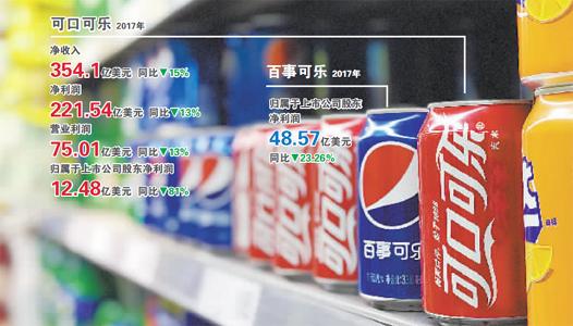 根据业绩报告显示,2017年,可口可乐净收入为354.1亿美元,同比下滑15%;净利润为221.54亿美元,同比下滑13%;营业利润为75.01亿美元,同比下滑13%;归属于上市公司股东的净利润为12.48亿美元,同比下滑高达81%。同时,百事可乐的业绩也不乐观。数据显示,2017年,百事可乐净利润为48.57亿美元,同比下滑23.26%。