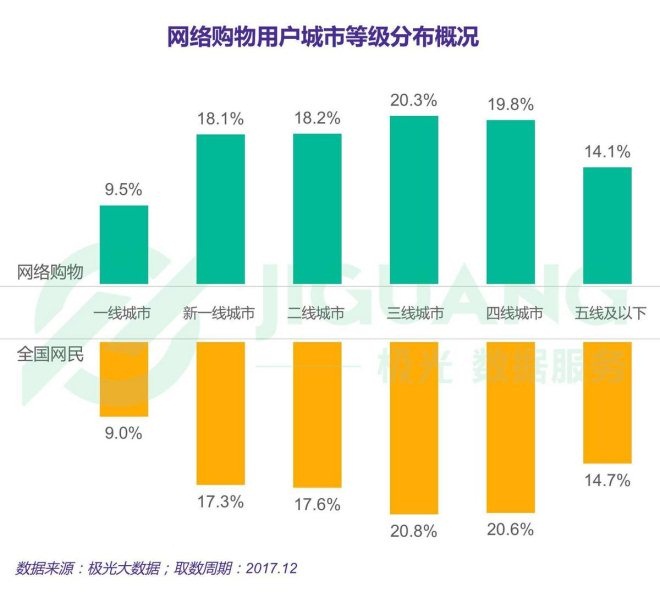 根据极光大数据的统计,截止2017年12月,网购人群规模达到了7.13亿(按照CNNIC的数据,当时的网民总数为7.72亿),其中,3线以下城市的网购人群占比54.2%,约为3.86亿,1,2线城市的人数约为3.27亿,按照拼多多目标人群的构成比例,大约可以推算出其目标人群的极值为1..8~2亿左右。
