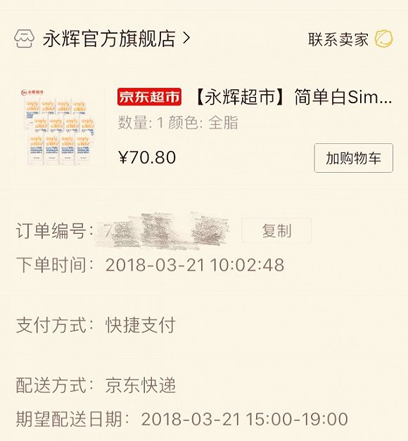 3月21日上午10点,界面新闻记者尝试从永辉京东店下单,订单显示当日下午15-17点可以送达,配送方为京东快递。这意味着在供应链方面,永辉和京东已经打通,至少永辉京东旗舰店内的商品,已经搬进了京东的仓库。