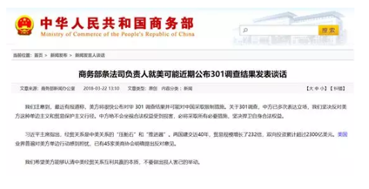2017年8月,美国贸易代表署(USTR)发布公告,正式对中国启动调查。这次调查是根据1974年贸易法案第301条款启动,目的在于查清“在技术转移、创新和知识产权保护方面,中国政府的政策和措施是否对美国的贸易利益有不合理的歧视或损害。”
