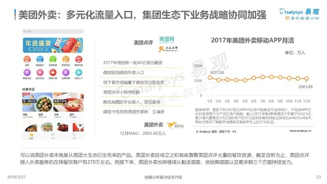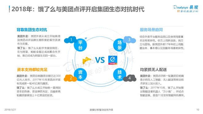 3、饿了么与美团外卖除平台自身以外,背后分别有着阿里以及腾讯的插旗,此番竞争格局下,两家平台短期内并无合并的可能。此外,外卖平台正通过渗透产业链上下游以及拓展服务场景以保持高速发展。