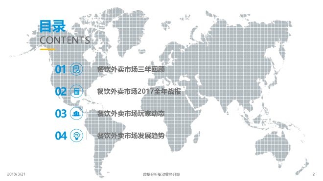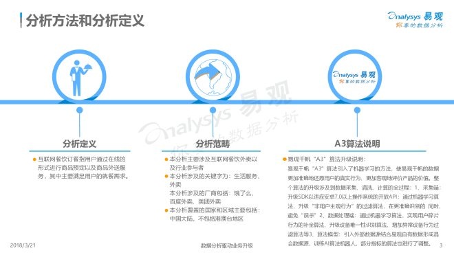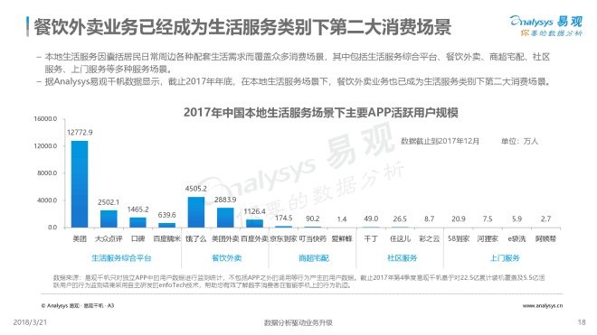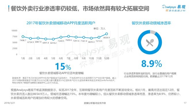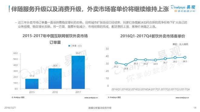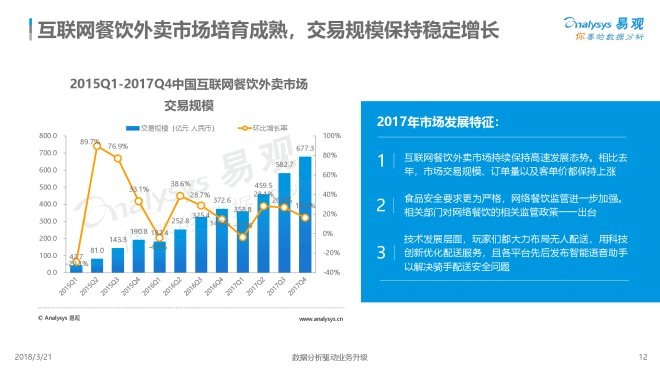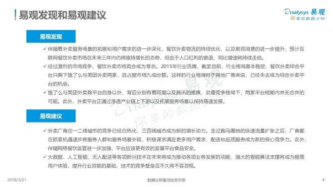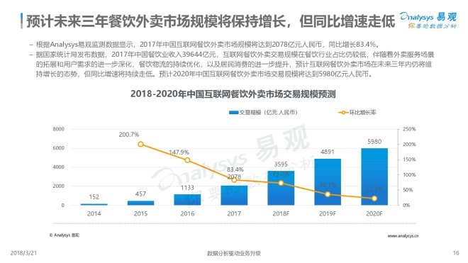 2018年3月21日,易观发布了《中国互联网餐饮外卖市场年度综合分析2018》的年度分析。伴随着外卖服务场景的拓展和用户需求的进一步深化,餐饮外卖物流的持续优化,以及居民消费的进一步提升,预计互联网餐饮外卖市场在未来三年内仍将维持增长的态势,但由于人口红利的衰退,同比增速将持续走低。