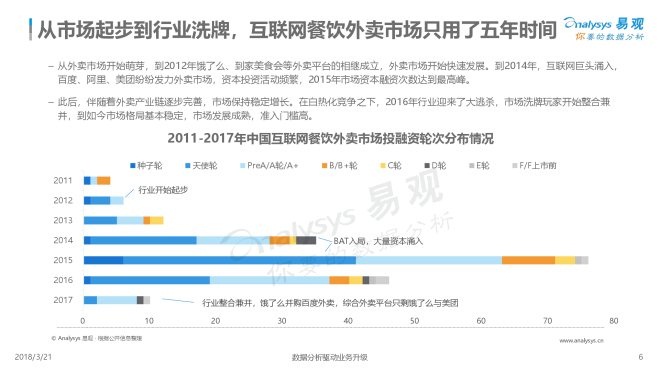 从2017年第1季度开始,饿了么加美团外卖的市场份额占比持续走高第1季度两者交易规模总和占市场份额的77.2%,到第4季度占比达到87.5%。市场高度集中,可谓是两强争霸。尽管如此,外卖市场竞争依旧高热,两强都在积极利用自己现有的优势与生态资源,尝试打出更好的市场配合。此外,2017年8月,饿了么正式对外宣布合并百度外卖,百度外卖作为饿了么的全资子公司独立运营。经此事件后,互联网餐饮外卖市场更是彻底从"三分天下"转变到了"两雄争霸〃的局面。也正对应年度投融资统计,有着美团和饿了么两大餐饮平台巨头在前,此时资本再入场已价值不大,市场融资频次大幅度缩减。