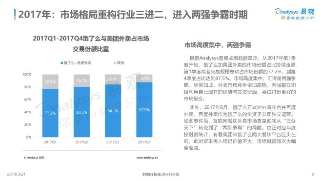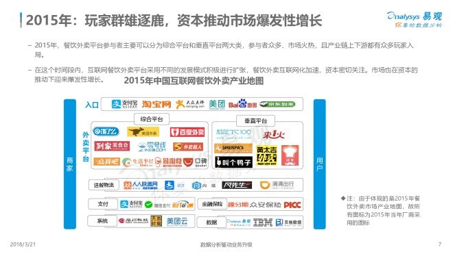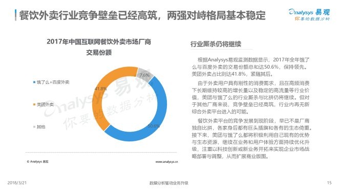 2、经过激烈的市场竞争,餐饮外卖市场竞合成为常态。2015年行业洗牌,截至目前,行业格局基本稳定,餐饮外卖综合平台只剩下饿了么与美团外卖两家,且占据市场九成份额。这样的行业格局对于其他厂商来说,已经失去成为综合外卖平台的机会。