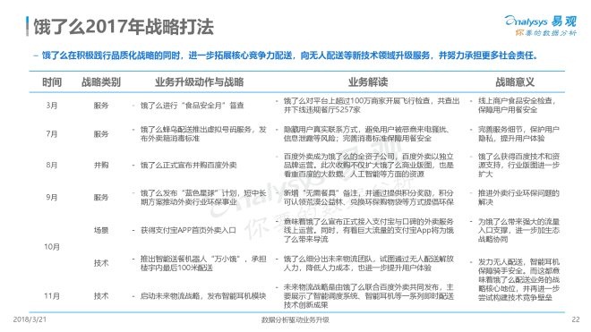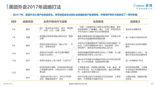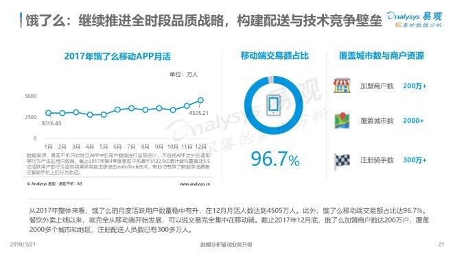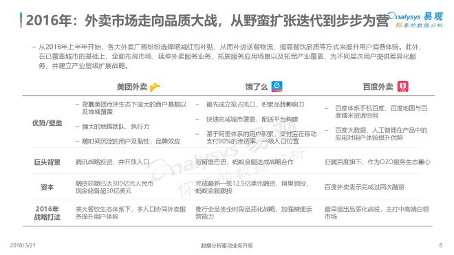 4、外卖厂商在一二线城市的竞争已经白热化,三四线城市成为新的增长动力。走过跑马圈地的快速流量扩张之后,厂商都在抓紧机遇逐步将服务人群和服务场景外延,积极谋求满足更多用户需求,配送和品质服务成为新的核心竞争力。此外,伴随网络餐饮监管进一步加强,平台应该更有效的监督平台食品安全。