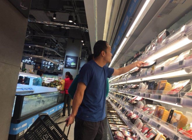 “想去超市买点东西,顺便吃个饭,于是就到盒马鲜生来了。”顾客郑女士是盒马鲜生的忠粉。她美滋滋地咬下一块烤羊肉,继续说道,“我都恨不得下班后在这儿吃饭时定个位(坐标),让配送人员把我要买的东西配好直接送餐桌来,吃完饭正好拎走,多方便,是吧?”