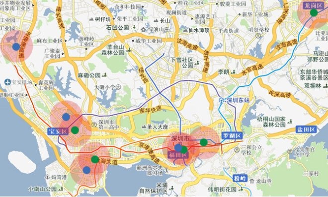 (注:蓝色圆点代表盒马,绿色圆点代表超级物种,红色半透明区域代表双方三公里配送范围)
