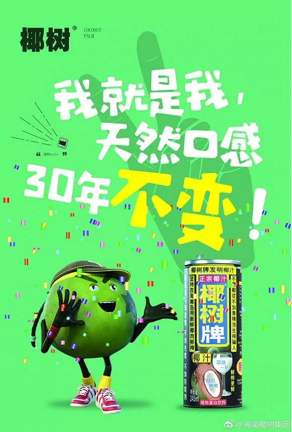 当你拿一个2018年和2017年的椰树椰汁包装作对比,会发现广告语从原来的“29年坚持在海南岛”换成了“30年坚持在海南岛”,这种严谨耿直的老派气质又在网络上引发了讨论。