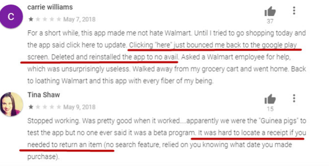 回到 Scan & Go 这个应用本身,顾客结账体验并没有很好。在 Google Play 中用户反映应用更新出错、支付过后无法找到收据等问题。无收银结算应用不好用,也是顾客对它如此冷淡的原因。